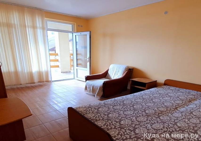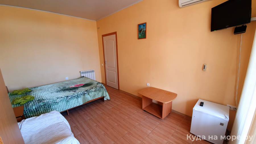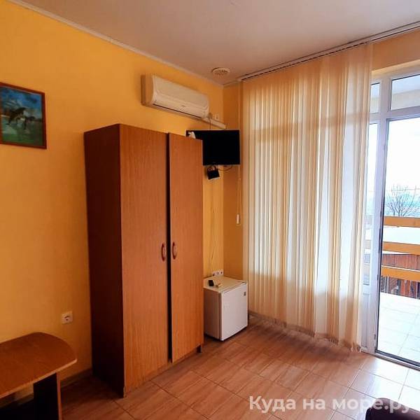Трехместный стандарт с видом на море. В номере душ, туалет, кондиционер, холодильник, телевизор, двуспальная кровать, раскладное кресло, шкаф, тумба, бесплатный интернет. Комфортный номер для тех, кто с ребенком.